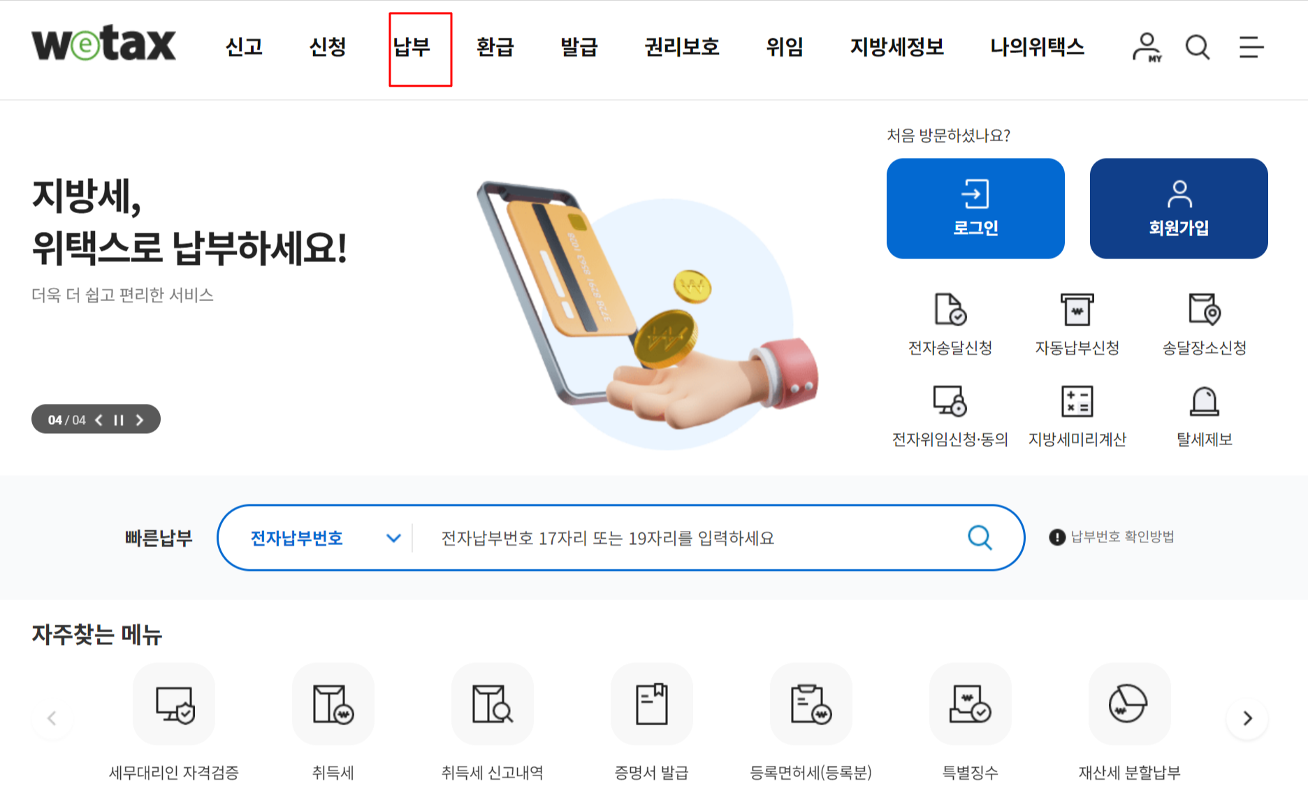재산세의 조회 및 납부는 위택스를 통해 간편하게 할 수 있습니다. 위택스 홈페이지에서 '납부대상 확인' 메뉴를 선택하면 인증 후 재산세를 확인할 수 있습니다. 또한, 인터넷 지로를 통해서도 온라인 납부가 가능하며, 은행에서 직접 현금, 신용카드, 체크카드로 납부할 수도 있습니다.