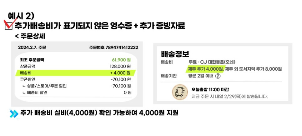 - 2024년 1월 1일 이후 택배 서비스 이용 시 발생한 추가배송비 결제 건이 지원 대상입니다.
