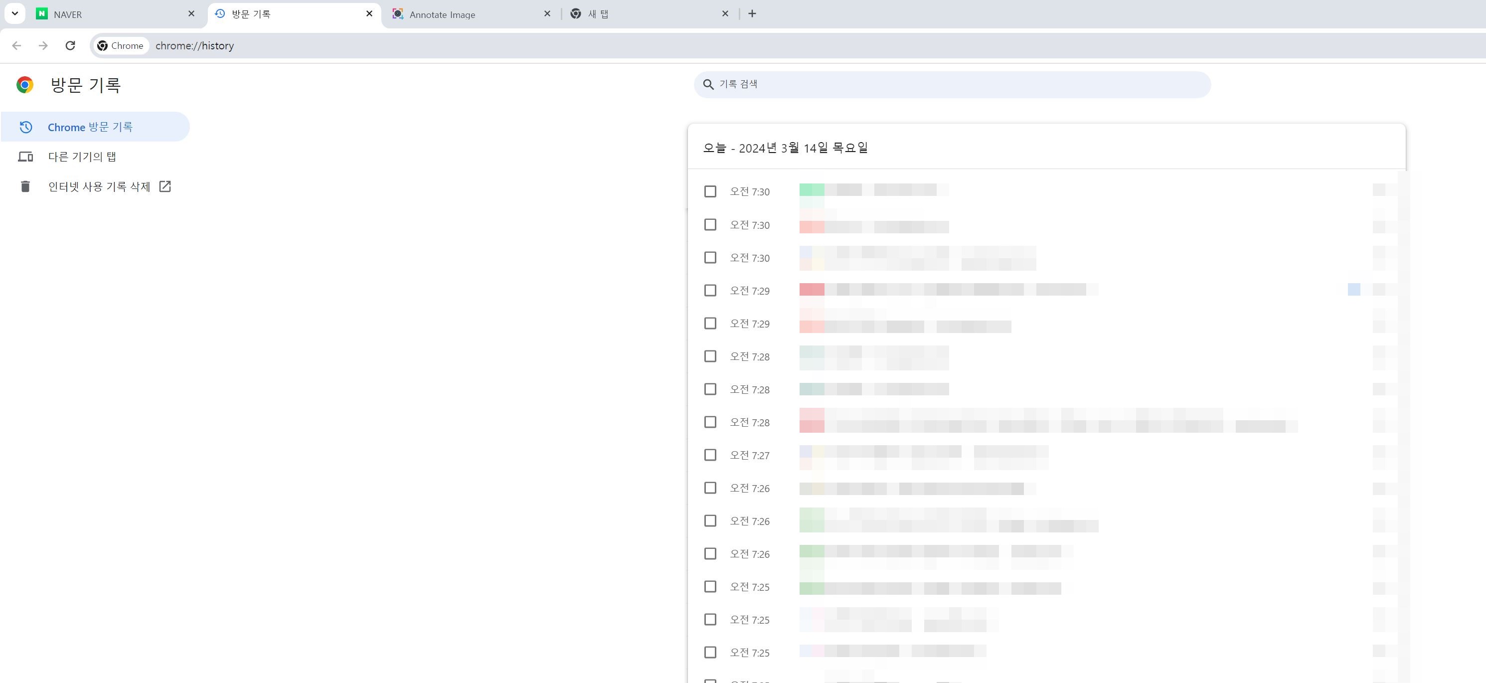들어가면 방문 기록 화면이 나타날텐데요. 좌측 사이드바에 보시면 인터넷 사용 기록 삭제 버튼이 보입니다. 클릭.