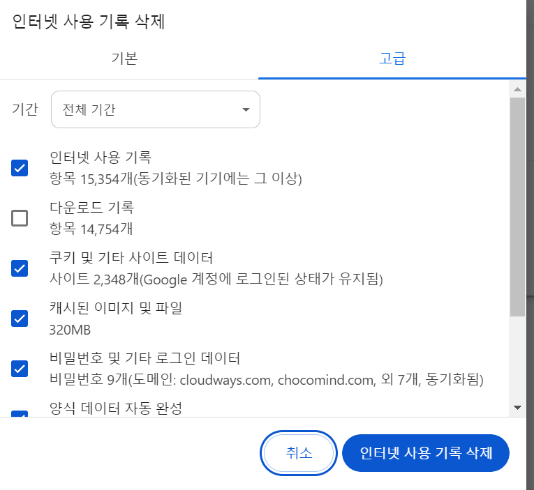 그러면 아래와 같이 삭제 항목을 선택하고, 검색 기록을 삭제 할 수가 있습니다.