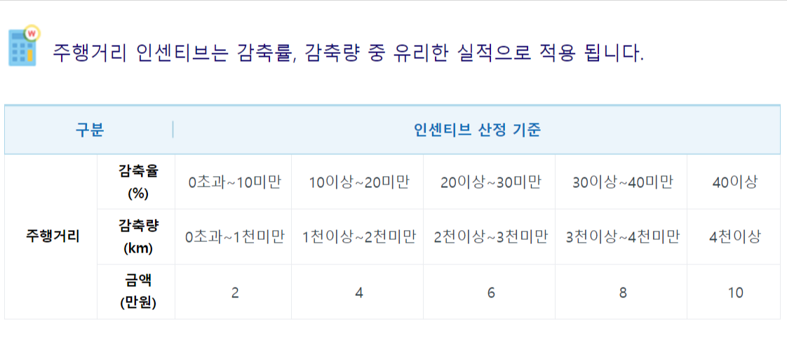 최종적으로 주행거리 감축 실적에 따라 인센티브가 지급됩니다. 이는 12월에 이루어지며, 감축된 주행거리에 따라 0부터 10만원까지의 금액이 지급됩니다.