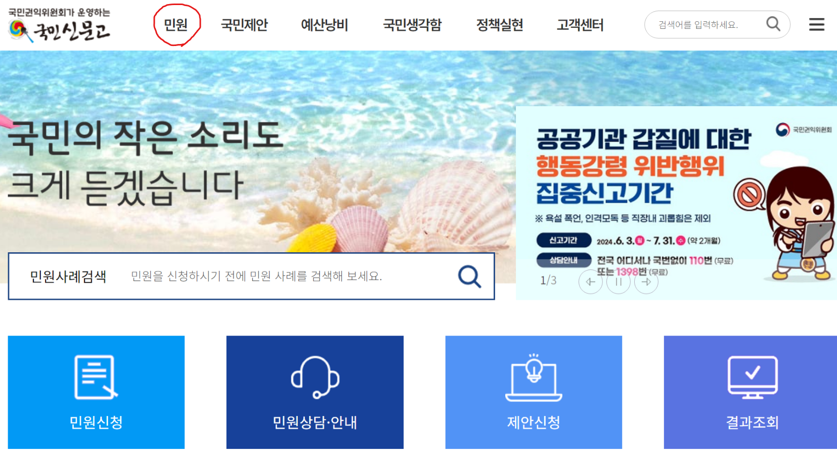 - 국민신문고 사이트에서 회원가입 및 로그인 후, 민원 메뉴로 이동합니다.