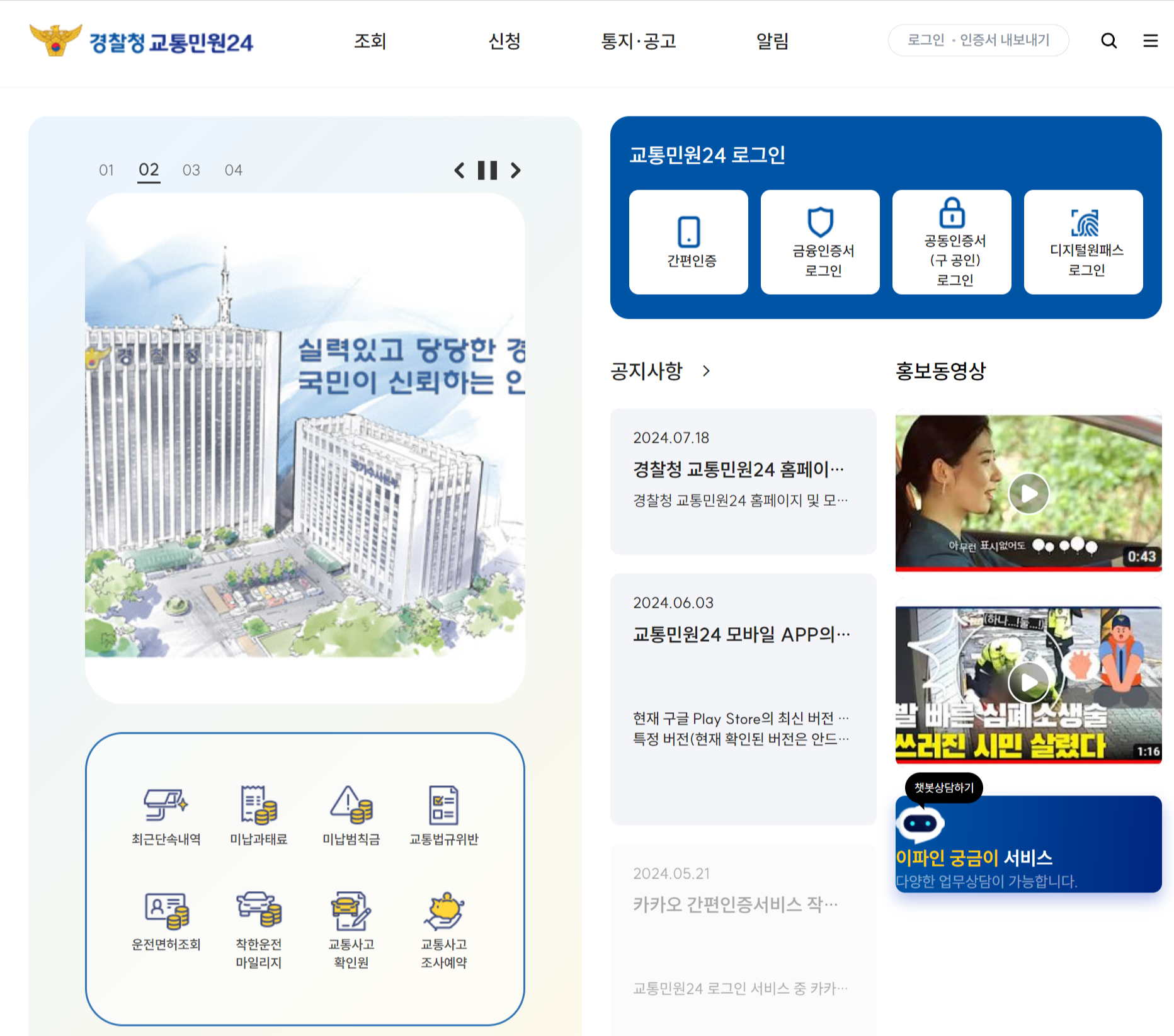 먼저, 이파인 홈페이지에 접속합니다. 홈페이지에 접속하면 여러 교통 관련 서비스와 정보를 확인할 수 있습니다. - 최근 무인단속내역 확인