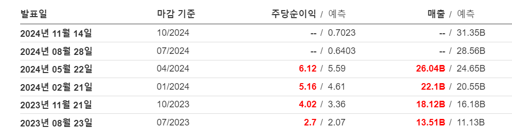 엔비디아의 주가가 현재 하락세를 보이고 있는 가운데, 주가가 반전될 가능성에 대한 관심이 집중되고 있습니다. 엔비디아의 다음 실적 발표일은 2024년 8월 28일로 예정되어 있습니다. 이 발표에서 월가의 예상을 뛰어넘는 성과가 발표된다면, 주가는 반등할 수 있는 계기를 맞이할 가능성이 큽니다.