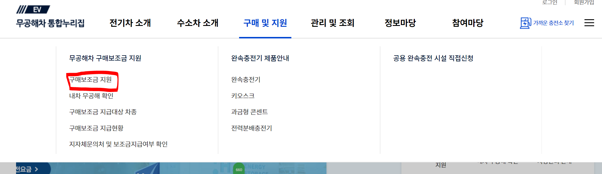 홈페이지에 접속하시고 상단 메뉴에 구매 및 지원 > 구매보조금 지원 순으로 접속합니다.