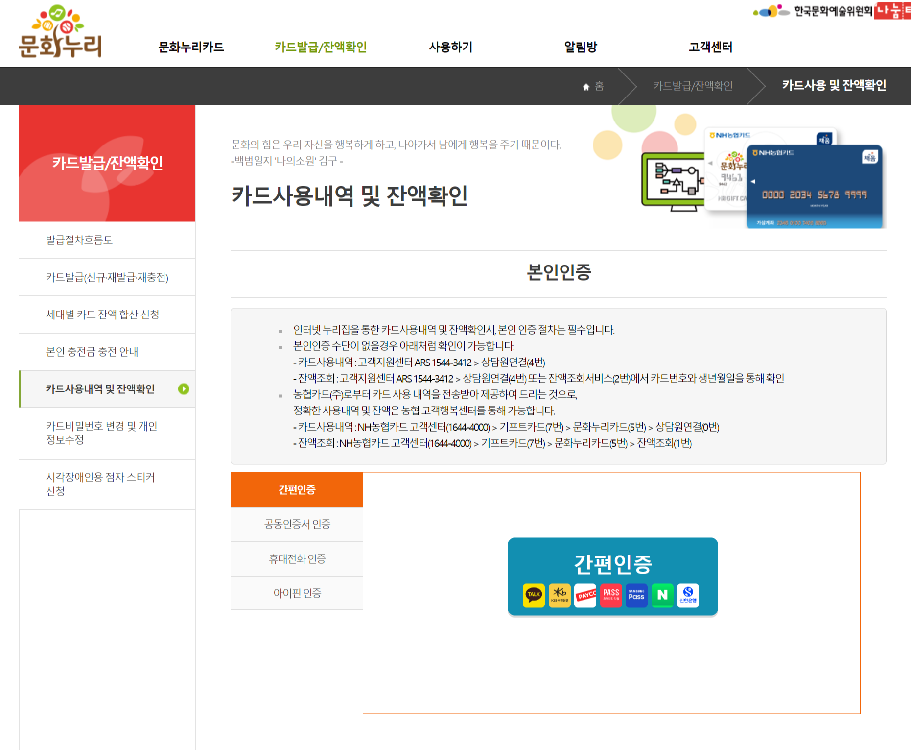pc를 이용하는 경우, 문화누리카드 홈페이지에서 간단하게 확인이 가능합니다만, pc 확인이 어려운 경우 아래 다른 방법들을 참고하시기 바랍니다.